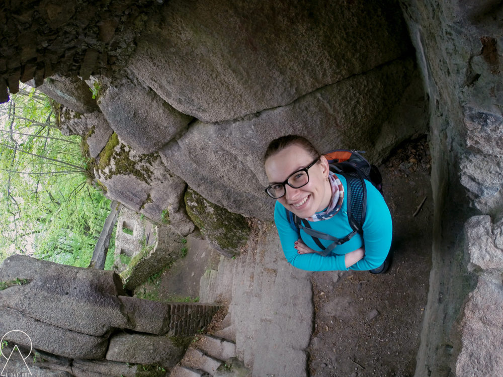 Czułam się jak odkrywca! Trud się opłacił mimo, że na pierwszy rzut oka, zamek dupy nie urywa. Jednak po przekroczeniu progów, czuć pewnego rodzaju chłód, a jednocześnie dziki i romantyczny nastrój. Czułam, że poniekąd dotykam tajemnicy skrywanej od wieków. Tak, od wieków, gdyż historia tych murów zaczęła się po roku 1367. Ponad 650 lat historii na wyciągnięcie ręki! Mimo, że wnętrza się nie ostały, to zamek urzeka surowością i w dalszym ciągu dla najbardziej ciekawskich odkrywa małe tajemnice. By odkryć jedną z nich wystarczy wejść na piętro, a panorama Rudaw Janowickich jest nasza. Jeżeli oglądaliście w latach 90/00 serial „Zaginiony świat”, to wiecie o jakich widokach mówię. Lasy, lasy i góry. Myślę, że gdyby teraz koło zamku dać dinozaury, to można by tu nakręcić jedną ze scen do tego filmu!